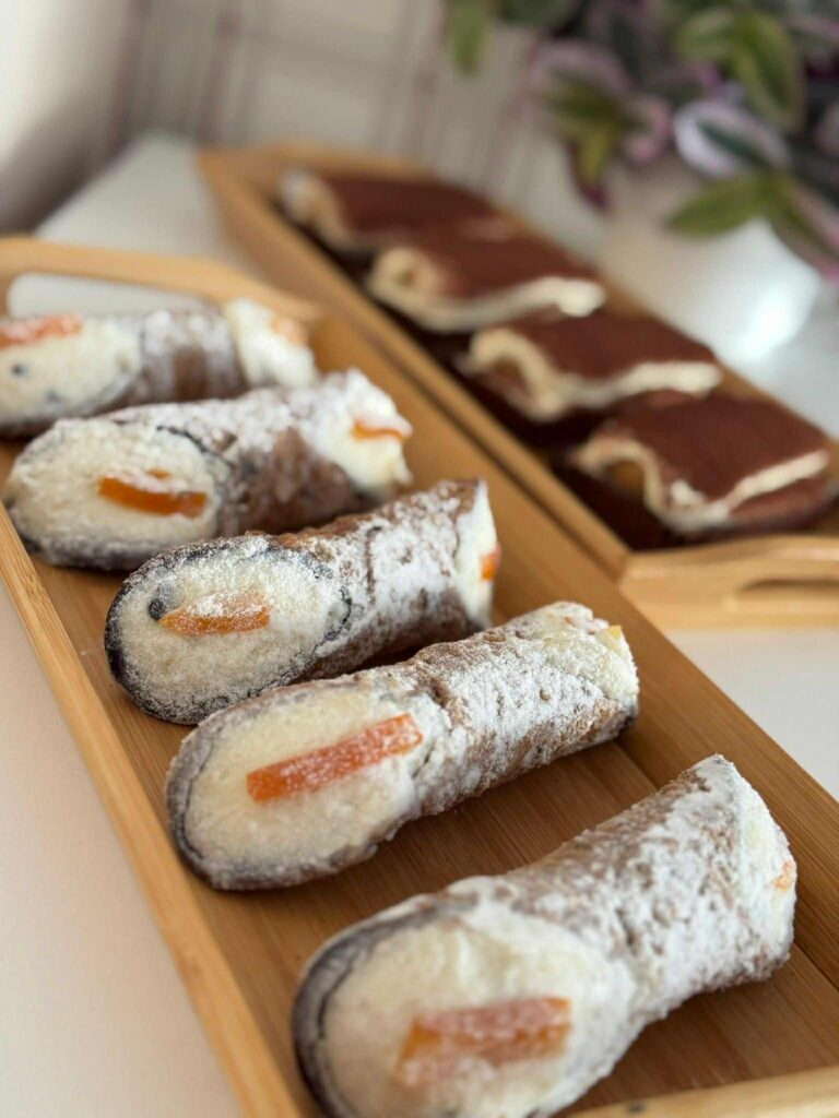 Crispy pastry shells filled with smooth, sweet ricotta cream, finished with a touch of candied fruit.