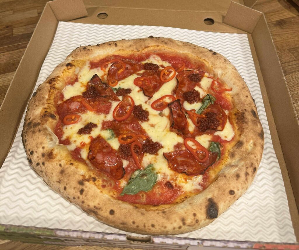 Italian T. sauce, fior di latte mozzarella, spicy nduja salami, smoked chorizo, red chillies, fresh basil.
