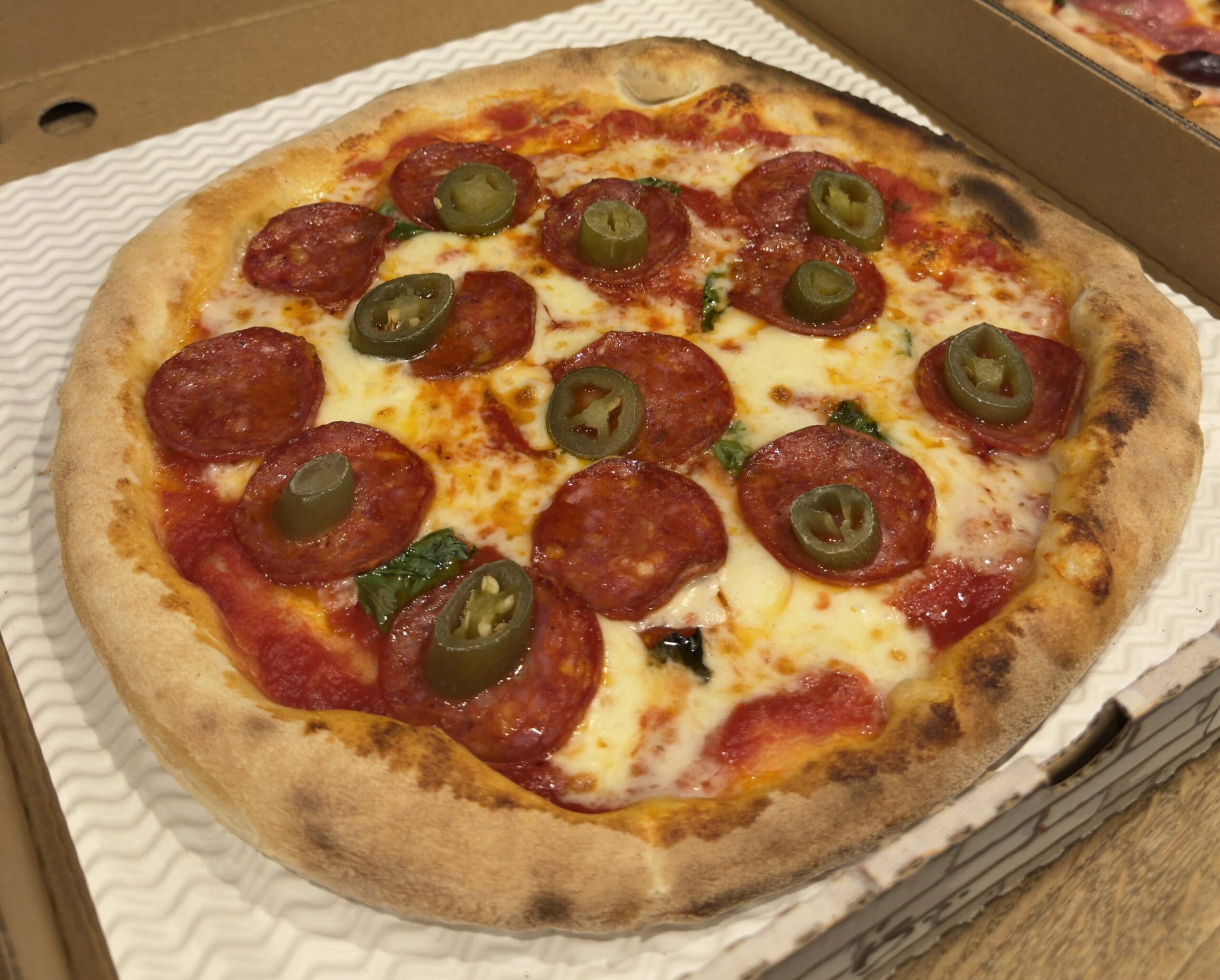 Italian T. sauce, fior di latte mozzarella, pepperoni, jalapeños, finished with hot honey – (optional).
